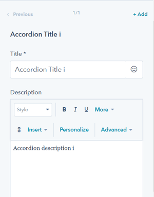 Tip: Depending on the complexity of the "answers" to your FAQ, it could be better to create the first item and then use the clone function to retain the formatting vs. using the +Add to create a set number of default items. If you have fairly simple Q&A without a lot of formatting, there is also a + Add link within the item settings to easily add additional items one after the other.