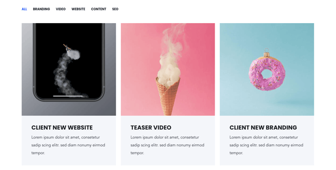 Comma separated categories can be configured for each image box. If image boxes shall be grouped in the same category, make sure to specify the same category names. You can choose to show the category "All" and which category should be active on page load in the module settings.
